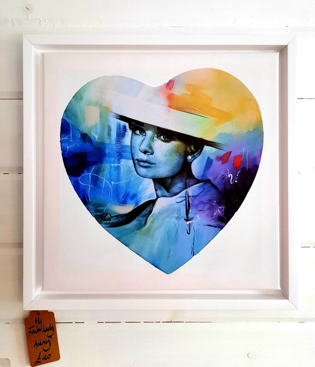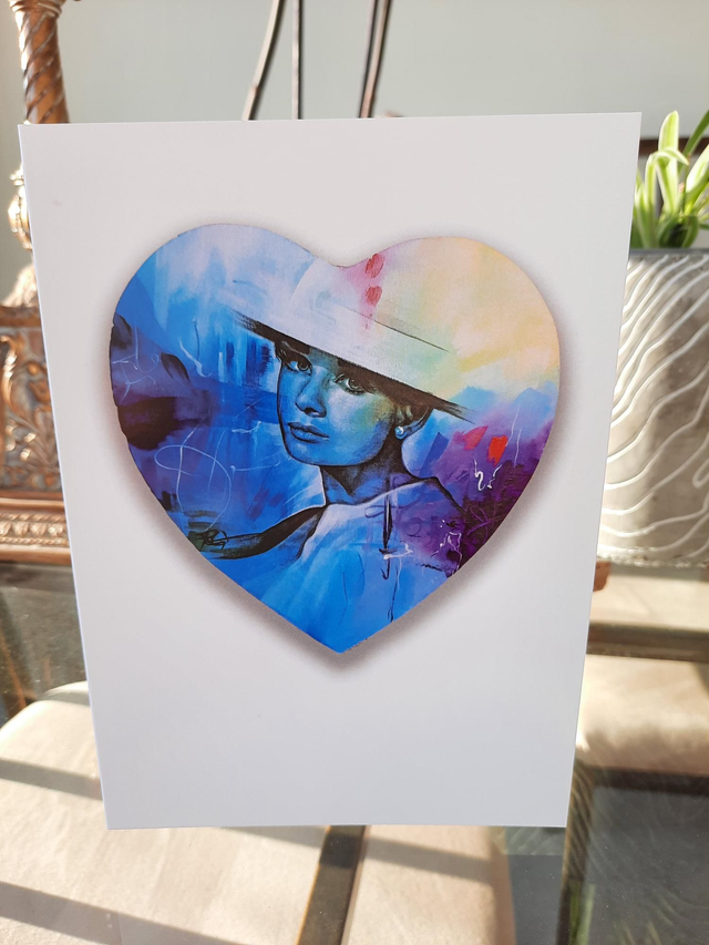 An A5 sized greeting card featuring the artwork 'Audrey Hepburn Heart', blank inside, and comes with a white envelope and cellophane sleeve.