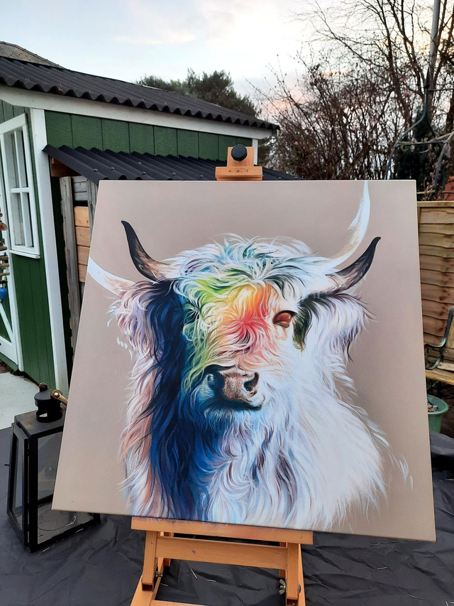 A painting titled Two Spirit Cow, painted using acrylics on box canvas, size 60x60cm.